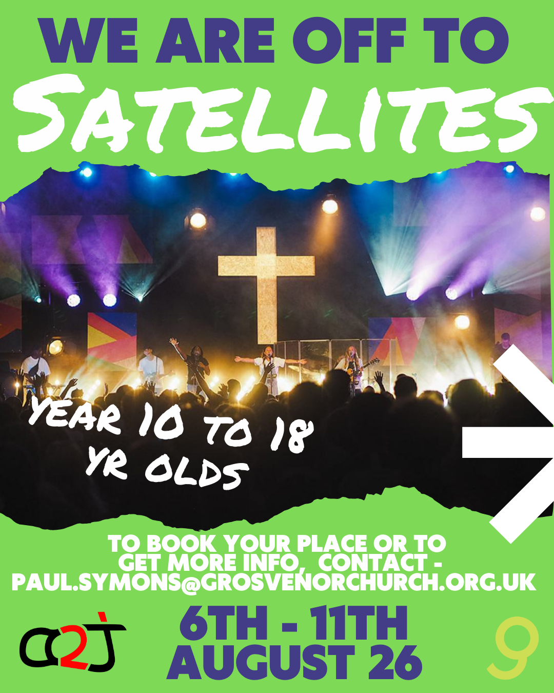 The dates for Satellites are 6th August – 11th August 2026. We’ll meet at Grosvenor Church at around 11am on the 6th and we’ll be back about 11th at lunchtime.